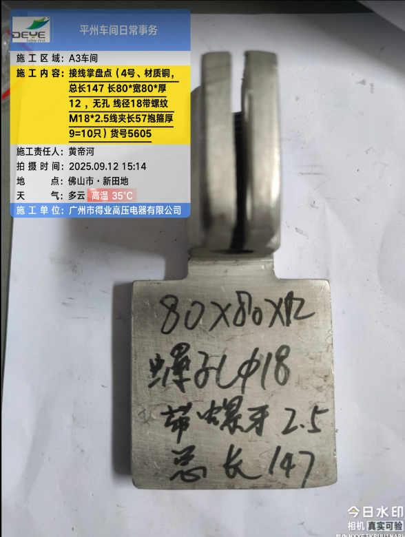 铜 接线掌 未打孔 总长147 掌长80 掌宽80 掌厚12 孔数无 孔径无 邻边孔距无 对角孔距无 线夹长度57 线管内径及螺纹M18*2.5 抱箍厚度9 有图纸 内部编号4