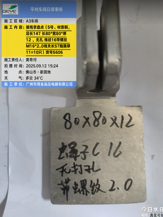 铜 接线掌 未打孔 总长147 掌长80 掌宽80 掌厚12 孔数无 孔径无 邻边孔距无 对角孔距无 线夹长度57 线管内径及螺纹M16*2.0 抱箍厚度11 有图纸 内部编号5
