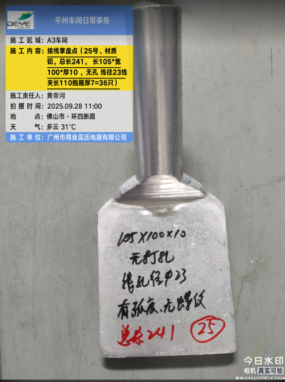 铝 接线掌 未打孔 总长241 掌长105 掌宽100 掌厚10 孔数无 孔径无 邻边孔距无 对角孔距无 线夹长度110 线管内径φ23 抱箍厚度7 有图纸 内部编号25