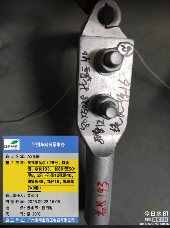 铝 接线掌 直型总长193 掌长80 掌宽50 掌厚8 孔数2 孔径φ12 邻边孔距40*40 对角孔距无 线夹长度89 线管内径φ16 抱箍厚度φ7 L型尺寸看描述 有图纸 内部编号29